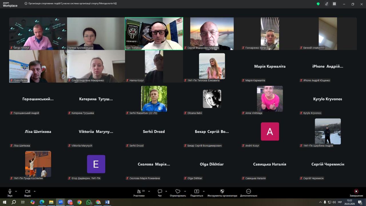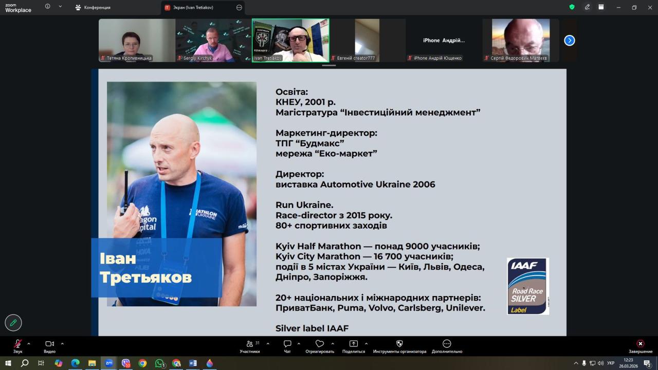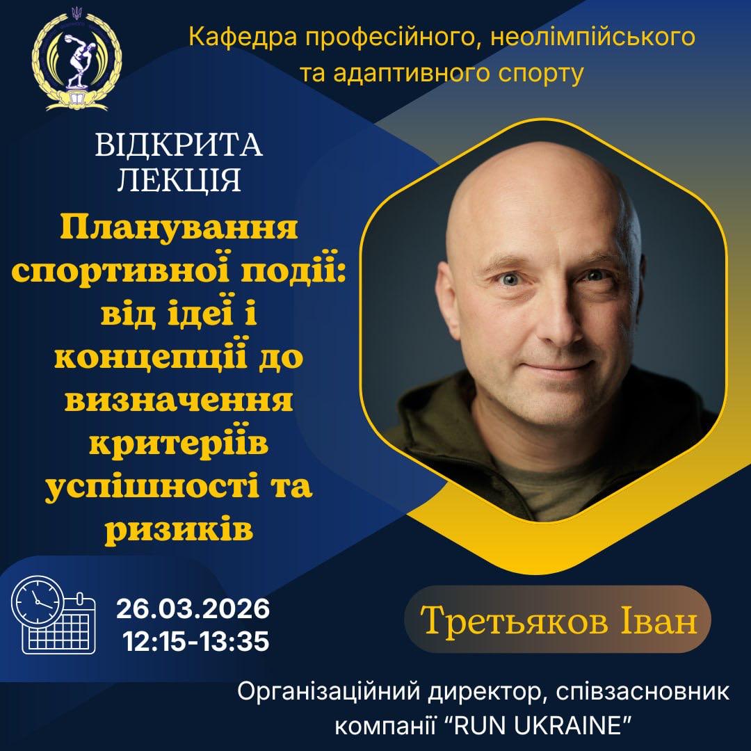 26 березня відбулася перша відкрита гостьова лекція з курсу «Організація спортивних подій», яка об’єднала студентів, викладачів і представників спортивної спільноти. Лектором виступив Іван Третьяков, організаційний директор RUN UKRAINE, який розкрив тему «Планування спортивної події: від ідеї і концепції до визначення критеріїв успішності та ризиків».