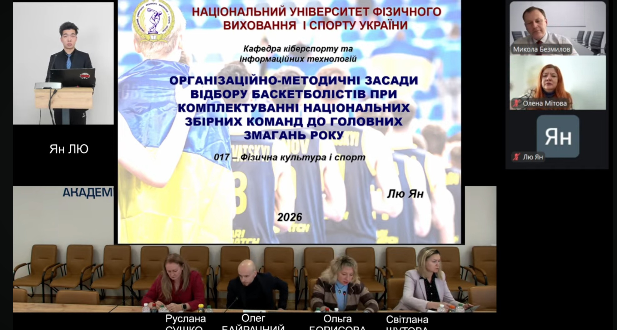 28 січня 2026 р. на засіданні спеціалізованої вченої ради ДФ 26.017.01; PhD 11443 Національного університету фізичного виховання і спорту України відбувся успішний захист дисертаційної роботи Лю Яна «Організаційно-методичні засади відбору баскетболістів при комплектуванні національних збірних команд до головних змагань року» з метою присудження йому ступеня доктора філософії з галузі знань 01 Освіта / Педагогіка за спеціальністю 017 Фізична культура і спорт.